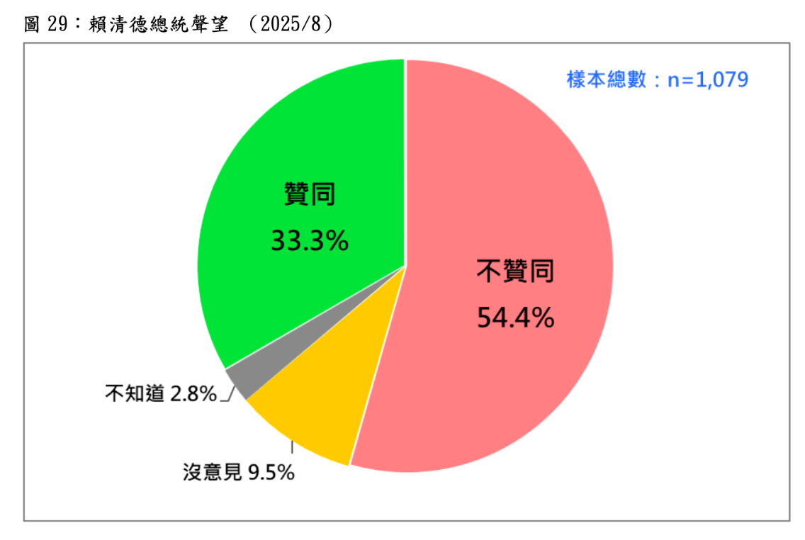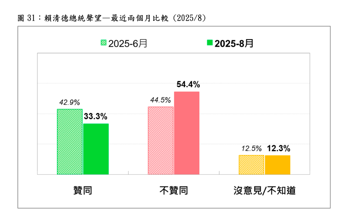 根據台灣民意基金會的調查顯示,賴清德的「總統職務表現贊同率」較上個月下降9.6個百分點,不贊同率則上升9.9個百分點。具體而言,8.5%的民眾「非常贊同」,24.8%「還算贊同」,而24.5%「不太贊同」,29.9%「一點也不贊同」。