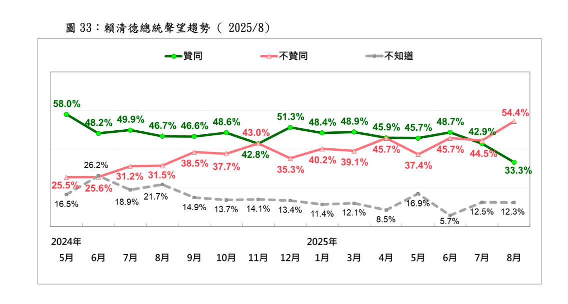 根據最新公布的兩份民調,賴清德總統的施政滿意度呈現大幅下滑,顯示其執政正面臨嚴峻挑戰。根據今(12)日早公布的台灣民意基金會的民調顯示,僅33.3%的民眾贊同賴清德處理國家大事的方式,54.4%表示不贊同,不滿意度遠超滿意度21.1個百分點。