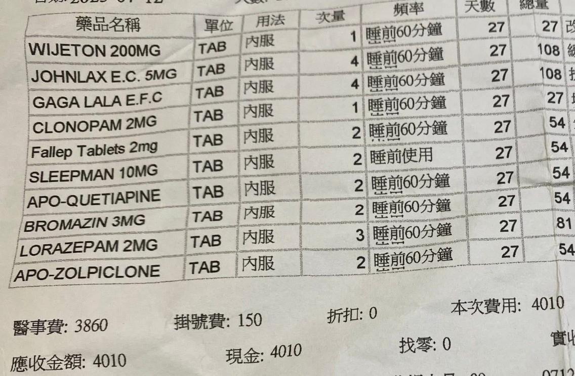 全新生活診所院長、身心科醫師馮尚淳在臉書發文回憶,該病患原本長期在台中看診,今年3月因搬回南部照顧父母,改上網搜尋「高評價診所」續醫,沒想到該診所每月回診不斷加藥,到第4個月(7月)時,處方已達睡前23顆藥,一個月藥費約4千元,外加每天8顆減肥藥,共5千元。