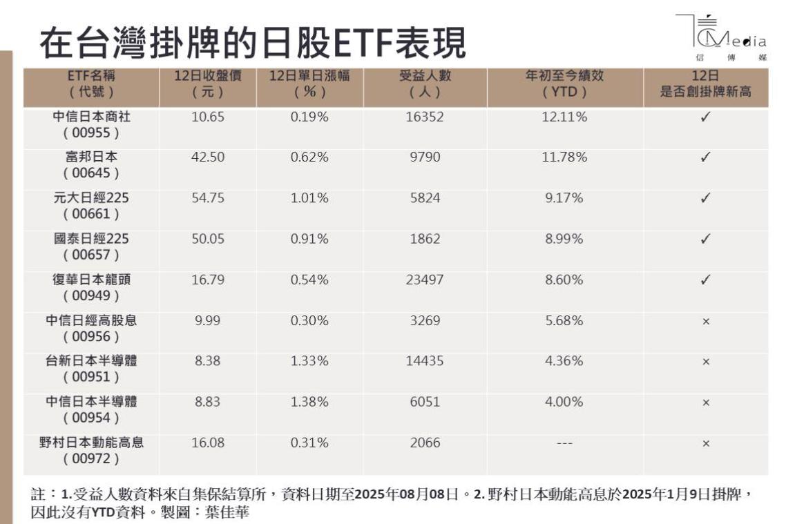 隨著日股強漲,也帶動在台灣掛牌的日股ETF表現,其中包括中信日本商社(00955)、富邦日本(00645)、元大日經225(00661)、國泰日經225(00657)、復華日本龍頭(00949)等5檔皆創下掛牌以來新高價。