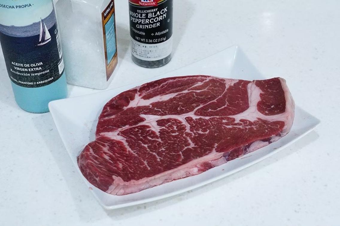 這次使用的是美國Prime等級的嫩肩沙朗牛排。製作牛排之前,一定要將牛排先放置在室溫20~30分鐘,充分回到室溫。開始製作時,先將牛排以紙巾將表面水份擦乾,使用鹽巴跟黑胡椒調味。接著進烤箱預熟。