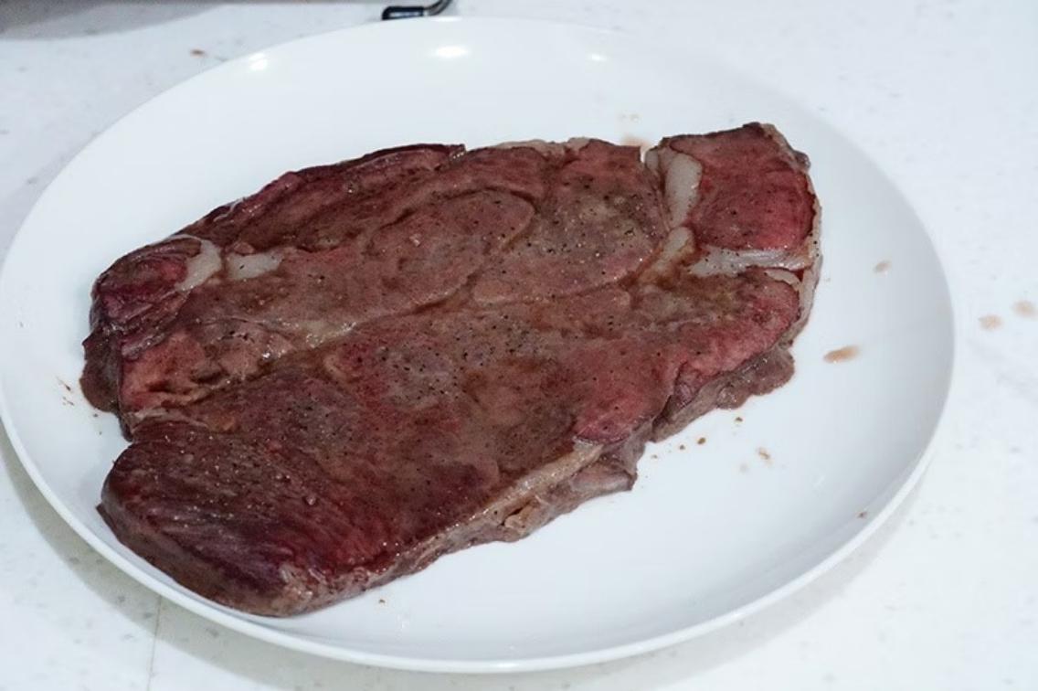 這次我想做五分熟牛排,烤10分鐘後出爐,大概會長下圖這樣子,半生不熟的感覺是正常。