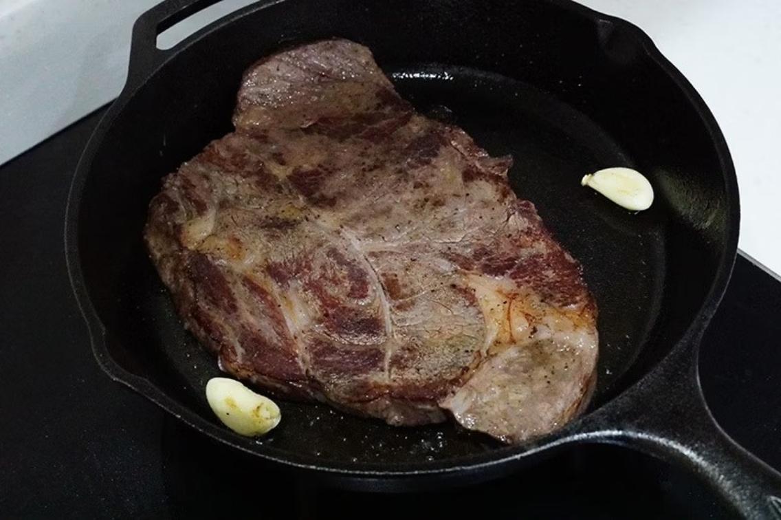 這時候取平底鍋充分熱鍋,加入橄欖油。當開始冒出油煙時就是下鍋時間點。因為已經經過烤箱預熟,下鍋後目標只要將表面上色,直接加入大蒜與奶油調味。牛排下鍋兩面各煎30秒~1分鐘即可起鍋。過程只需要翻面一次。