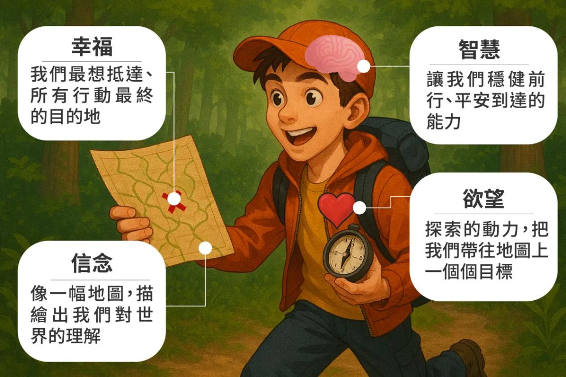 每個人行動背後的主要驅動力,往往來自兩個要素:信念(beliefs)、欲望(desires)。信念的集合像是一幅地圖,描繪出我們對世界的理解;欲望則是一股力量,把我們帶往地圖上一個個目標。如果這張地圖有一處我們最想抵達的地方、所有行動最終的指向,那個目的地就是名為「幸福」(well-being)的所在。