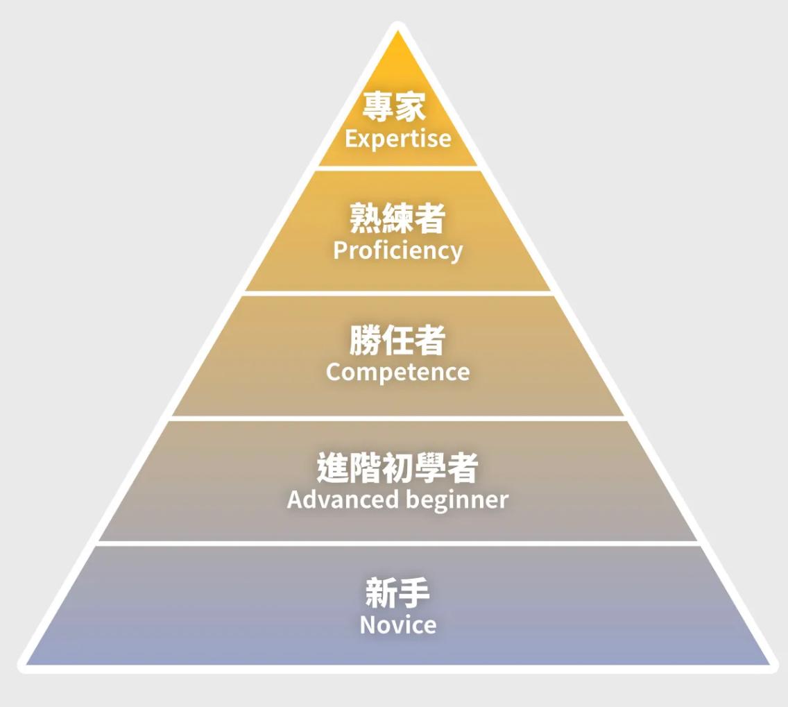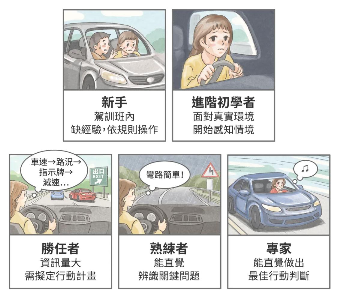 他參考了美國學者 Hubert Dreyfus 與 Stuart Dreyfus 兄弟提出的「技藝習得模型」,將智慧的學習過程分成以下五個階段:
