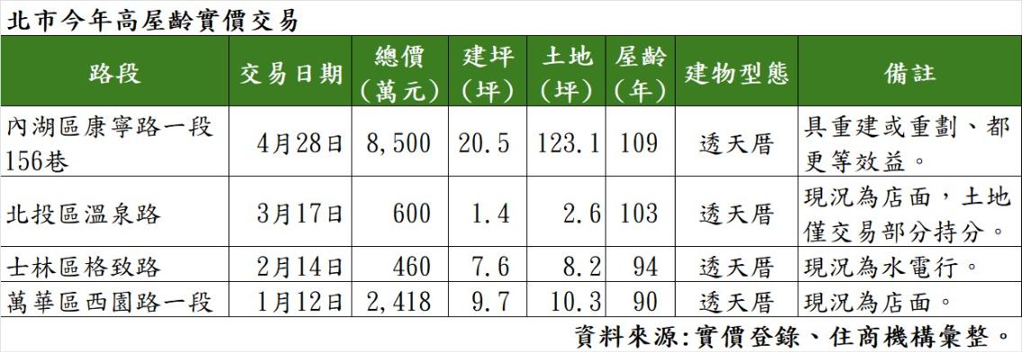綜觀未來,賴志昶認為,北市高屋齡建物成交案例自成一格,資產型買方並非全然看重建物使用價值,而是鎖定後續資產再開發效益,而隨著北市可開發土地越來越稀缺,未來類似交易將持續出現,特別是在捷運站或知名商圈周邊,此類老屋以地價撐房價的特性,將更趨明顯,也意味北市開發者在尋找開發土地過程中,這類產品也會走出一條新路。