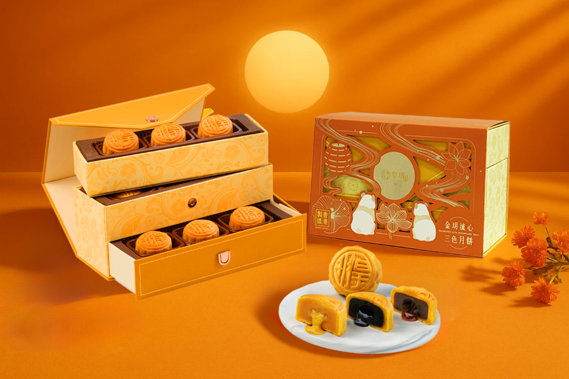 金色高雅三層設計禮盒猶如翻閱佳節回憶的溫暖篇章,象徵中秋圓滿與尊榮象徵。最適合企業送禮與聚餐分享。喜歡「流心陳皮紅豆沙月餅」的饕客,亦可選擇「紅韻流心雙輝月餅」6入/8入裝禮盒。