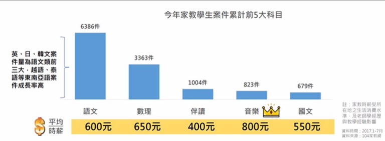 大學進入開學季,也是家教市場年度高峰。根據104統計有6成案件時薪大於500元,時薪800元以上近2成。語文需求最強,音樂含金量最高。104人力銀行多元服務部經理蕭甫明強調,家教時薪受所在地生活消費水平,以及老師學經歷、教學經驗等影響,但整體而言,家教薪資仍遠高於基本工資時薪133元,是許多大專院校生夢幻打工之一。