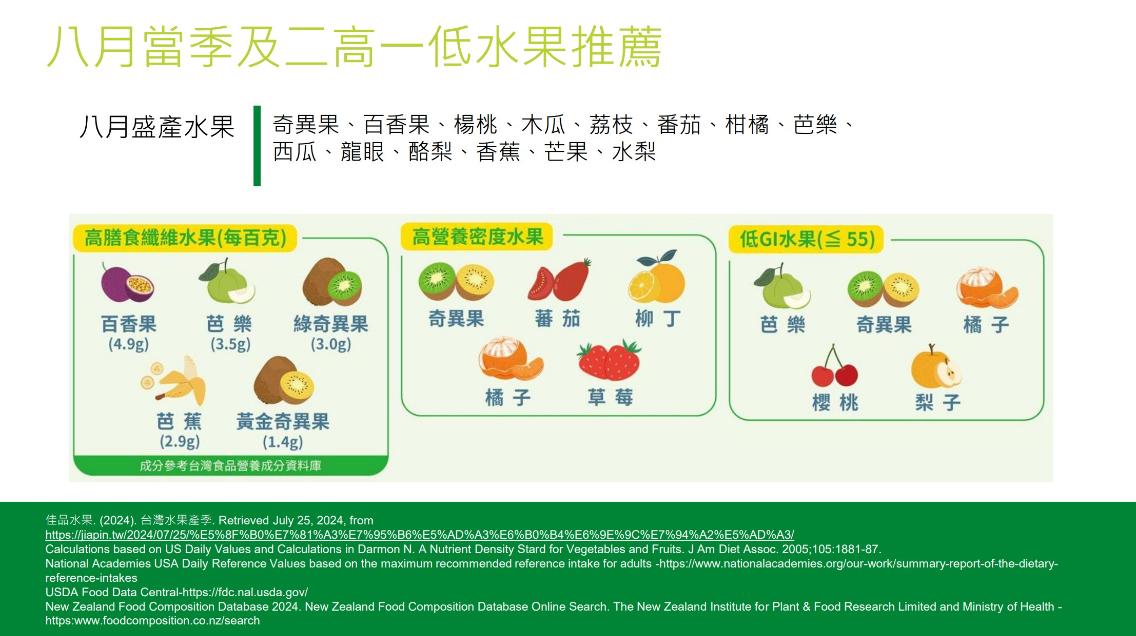 ●高膳食纖維水果:增加飽足感,減緩碳水化合物消化吸收,避免血糖快速上升,並預防血脂異常。例如百香果、芭樂、芭蕉、綠奇異果及黃金奇異果。