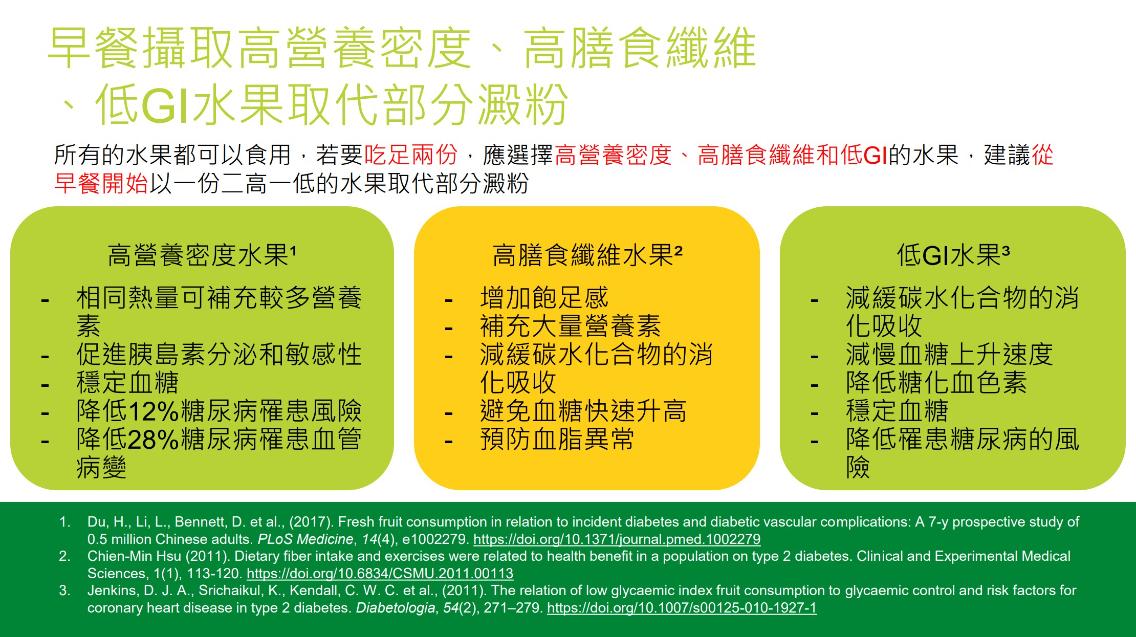 中華民國糖尿病衛教學會已印製衛教資料,提醒民眾正確食用水果,穩定血糖、降低糖尿病風險。醫師與營養師皆表示,日常生活中,只要掌握「高營養密度、高膳食纖維、低GI」三原則,每天200克水果的攝取量,即可輕鬆預防與控糖。