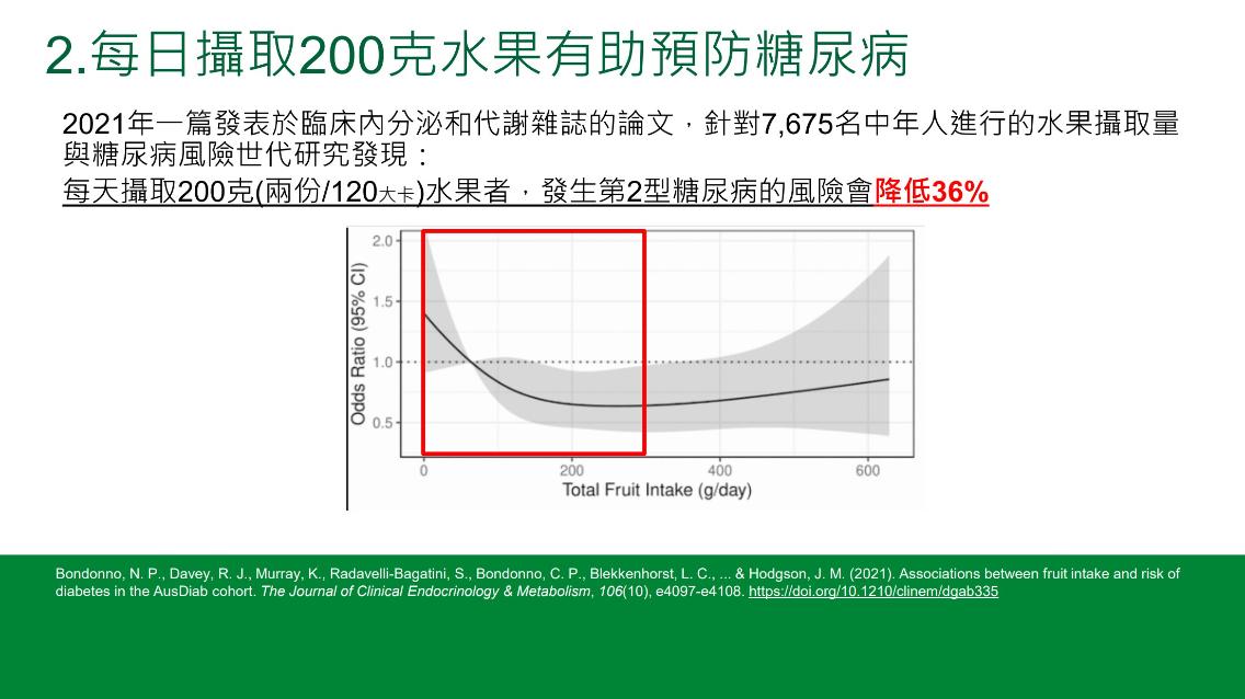 他指出,一項針對中國50萬成年人的研究顯示,每天攝取水果的人糖尿病風險降低12%,而微血管併發症發生風險則降低36%。另一項針對7,675名中年人的研究發現,每天攝取兩份以上水果的人,糖尿病發生風險可降低36%。