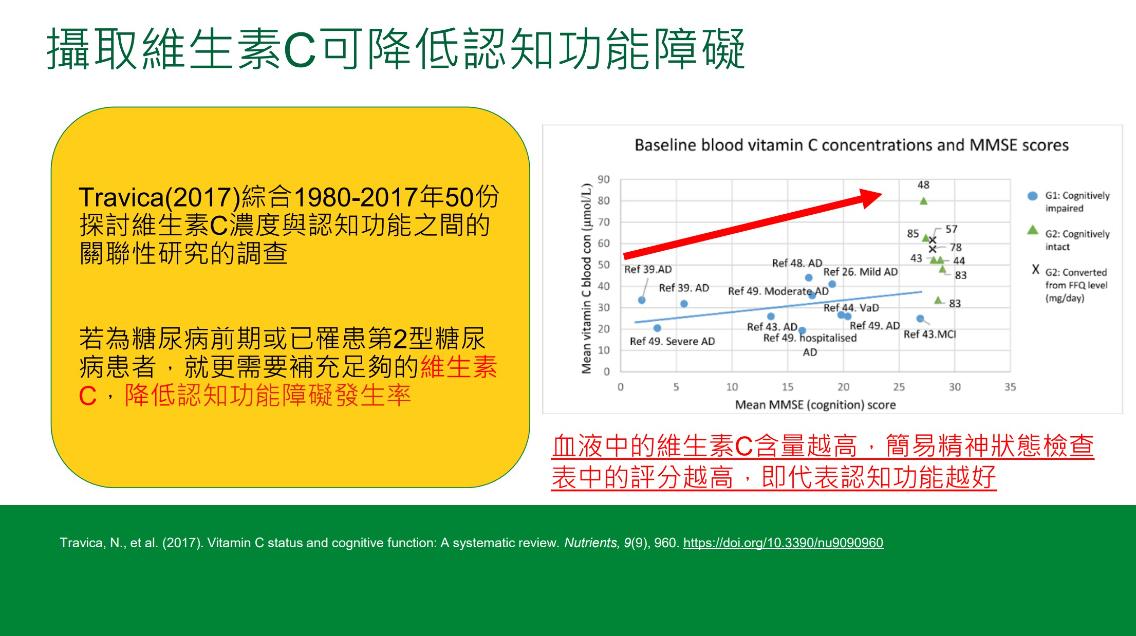 此外,充足的維生素C攝取可降低身體發炎反應,國際研究證實維生素C可降低認知功能障礙等糖尿病併發症風險。「透過水果攝取維生素C,可提升其利用率與轉換率,對糖尿病前期或已患第2型糖尿病者尤其重要。」