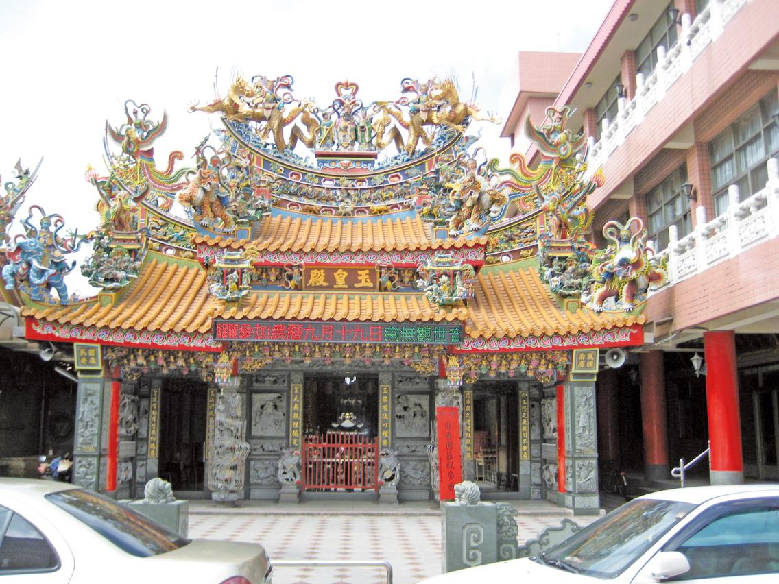 重簷歇山式屋頂,屋脊上剪黏、交趾燒之神像、花鳥,造型生動、色彩豔麗。這其中最特別的,就是中庭的楹柱迴廊牆面,復刻著由黃海泉蒐集之名人書家的書畫作品。壯觀的三層藻井,上層八卦,中層星宿圖。還有精采華麗的木雕神龕,以及2座石碑:「遷善社番勒索示禁碑」、「勸善碑」。來到沙鹿玉皇殿,除了參香祈福,勿錯過品味這些生動的雕繪作品、文物之美。