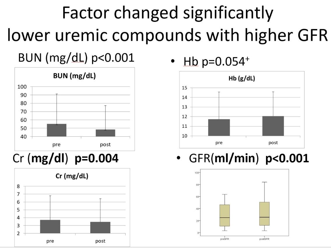 合作研究中,研究團隊分析了患者接受活性碳吸附療法前後的血液和腎臟功能變化。結果顯示,患者的腎絲球過濾率(eGFR)顯著提升(p<0.001),代表腎臟的過濾功能有所改善。同時,血清肌酸酐(Cr)和尿素氮(BUN)水準也顯著下降(p=0.004和p<0.001),這表示腎臟負擔減輕,腎功能得到明顯改善。(圖一)