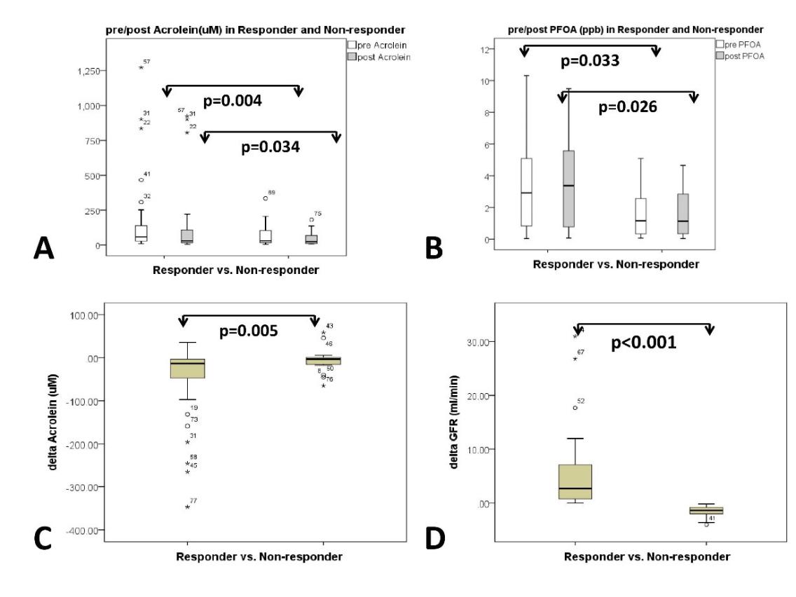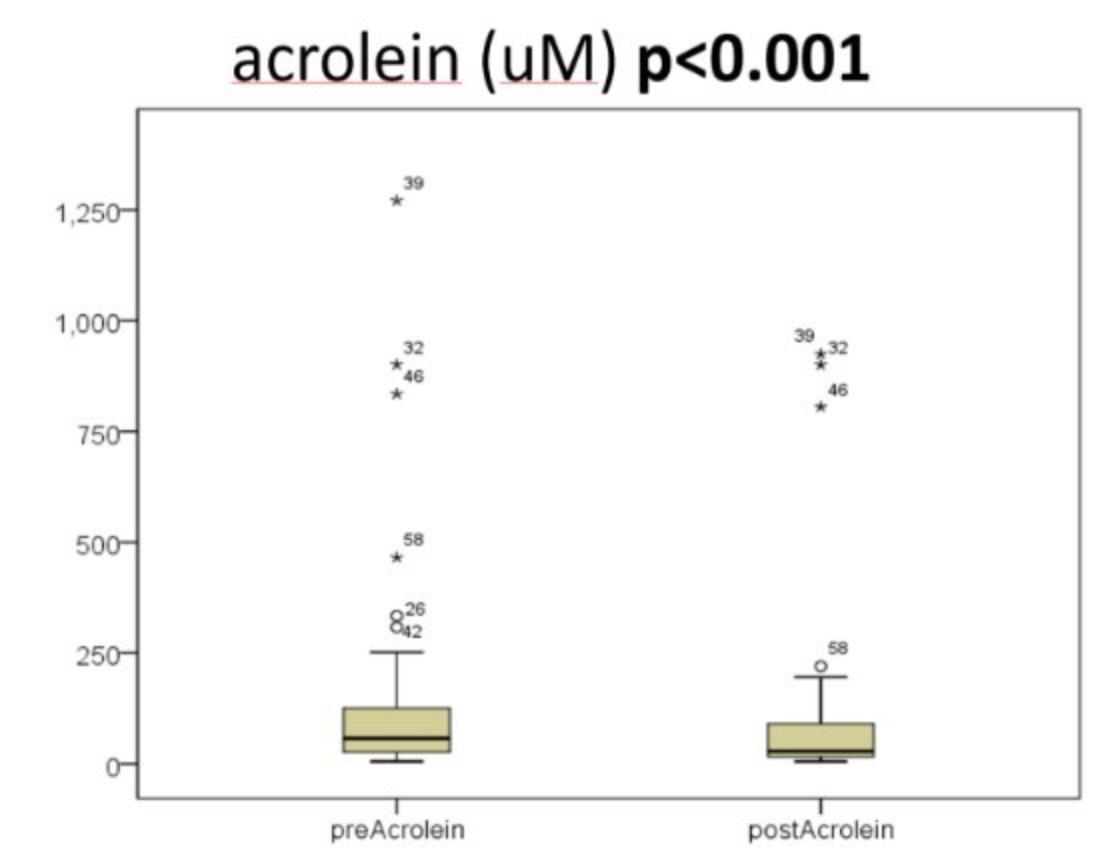 值得注意的是,整體81人的血紅素(Hb)也有些微提升,顯示血液狀況改善。此外,血清中丙烯醛的含量在治療後在腎功能改善的63人顯著降低(p<0.001),從測試前的136降至98(單位為μM,十的負六次方莫爾濃度),而腎功能未顯著改善的患者(18人)也有一定的下降,從48降到42。尤其是在腎功能改善的患者中,丙烯醛的改善兩組相比更為明顯(p=0.005),這證明該口服活性碳能有效吸附體內有害的丙烯醛,進而改善腎臟功能。(圖二、圖三)