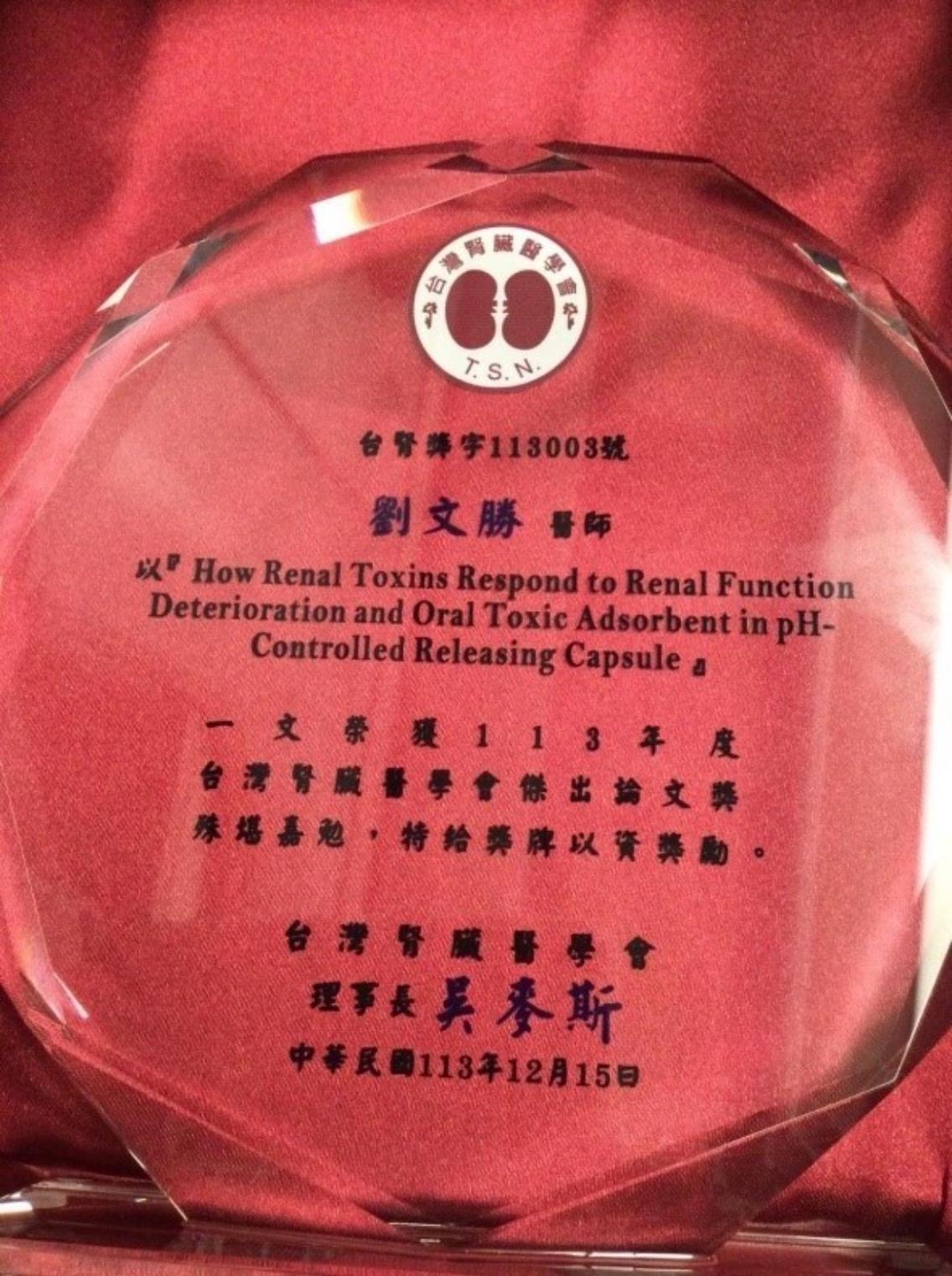 ※受中興院區院長蔡景耀指導,與陽明大學研究團隊,發表113年院內研究計畫:慢性腎病病患體內之環境毒素(丙烯醛acrolein)與相關發炎反應和口服活性碳吸附劑的影響的成果論文。https://pubmed.ncbi.nlm.nih.gov/38572829/