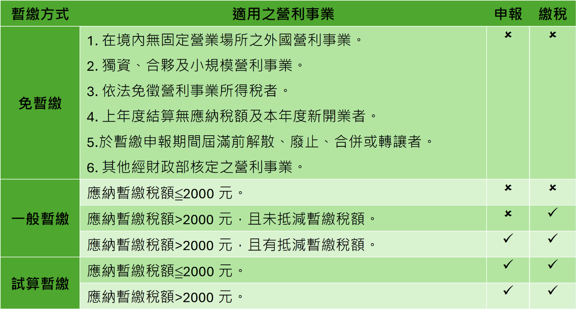 1. 一般暫繳之應納暫繳稅額≦2000元,則可免繳暫繳稅款亦免暫繳申報。