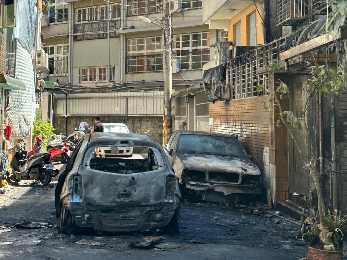 縱火現場兩旁的住宅被波及,旁邊停的汽車也被燒得精光。(照片來源/信傳媒編輯部)
