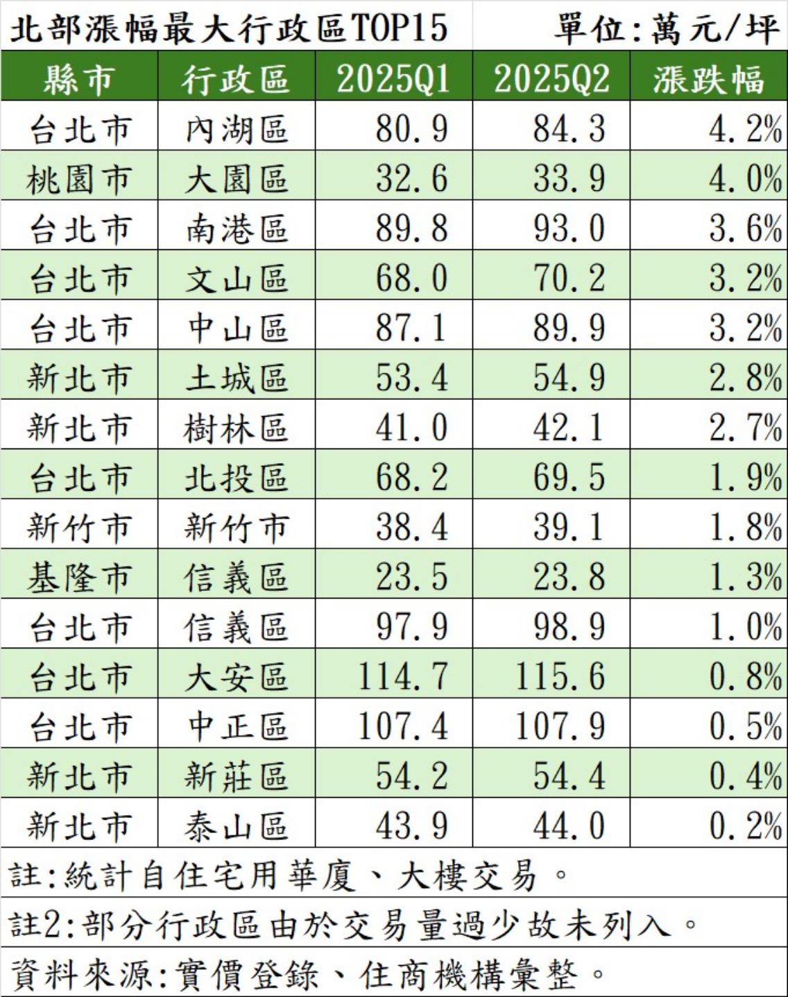 住商機構根據實價登錄資料,盤整台北市、新北市、桃園市、新竹縣、新竹市及基隆市各行政區第二季平均成交單價,並與第一季房價進行比較,其中北部幾乎各行政區皆呈現跌幅或是持平,僅15個行政區免強維持漲勢。其中,以台北市內湖區房價漲幅最高,第二季平均成交單價達84.3萬元,房價單季上揚 4.2%;另外,南港、中山與文山區則分別上漲3%左右,名列3~5名,至於信義、大安、中正、北投等區也有 0.5~1.9% 的小幅漲幅。