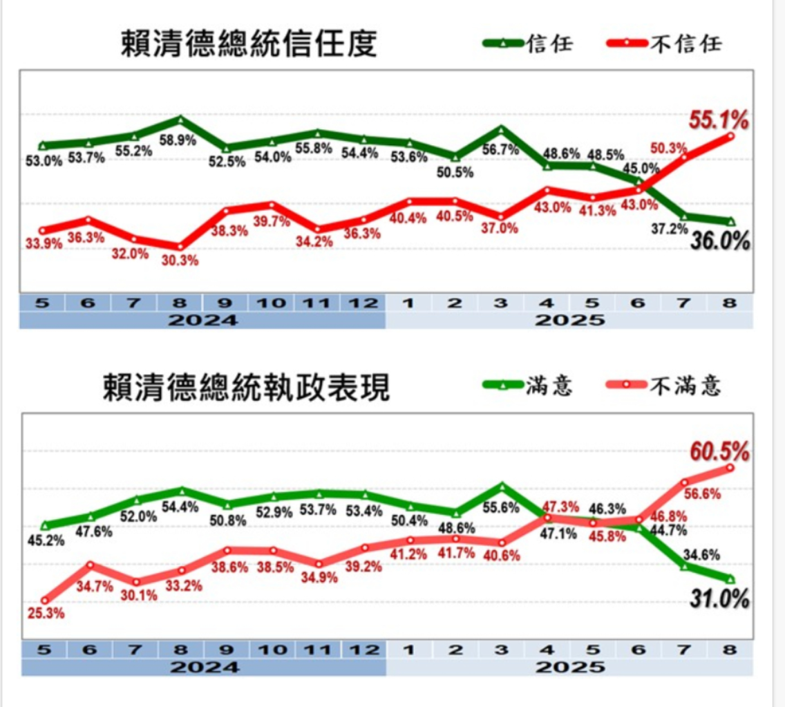 美麗島電子報今(28)日公布最新8月全國民調,結果顯示,民眾對國內經濟情勢普遍悲觀,超過六成受訪者認為經濟「不好」;總統賴清德的信任度與施政滿意度同樣陷入低谷,不信任高達55.1%、不滿意突破六成創下新高。大罷免雖未過關,但近半數民意解讀為「教訓民進黨」,顯示綠營面臨空前壓力。