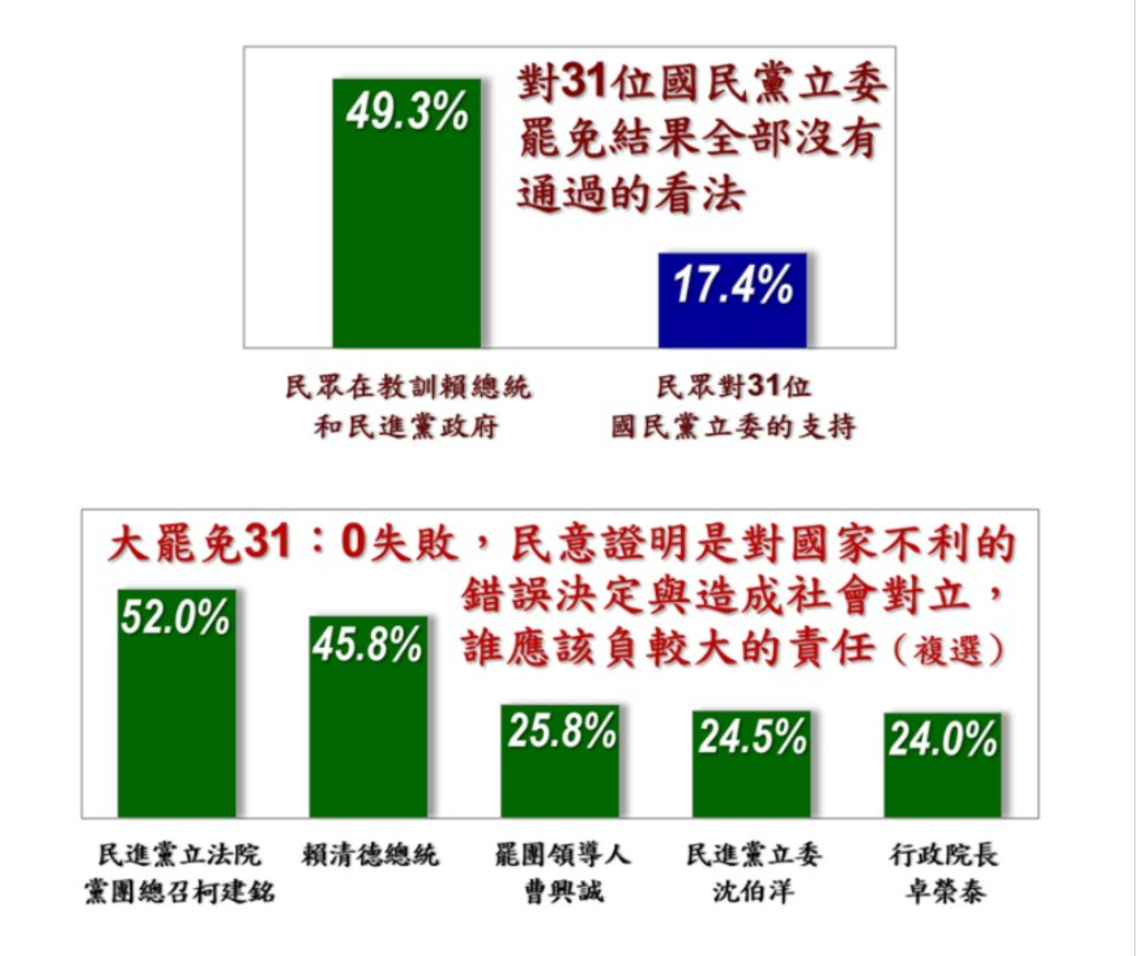 針對726及823國民黨立委罷免案全數失敗,49.3%受訪者認為這是「教訓賴總統和民進黨政府」,僅17.4%認為是「對國民黨立委的支持」。在責任歸屬部分,柯建銘(52.0%)與賴清德(45.8%)分別被點名為主要責任者。