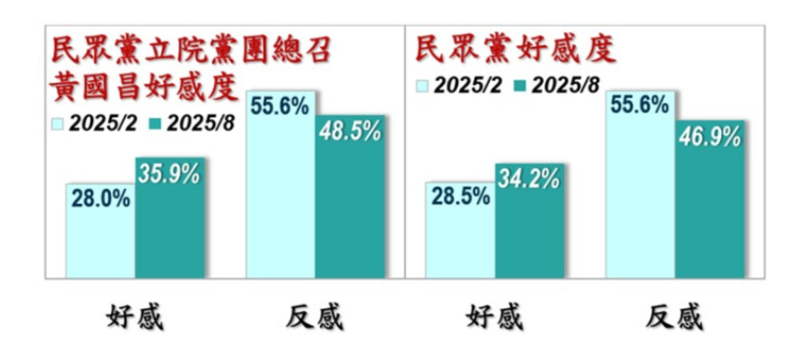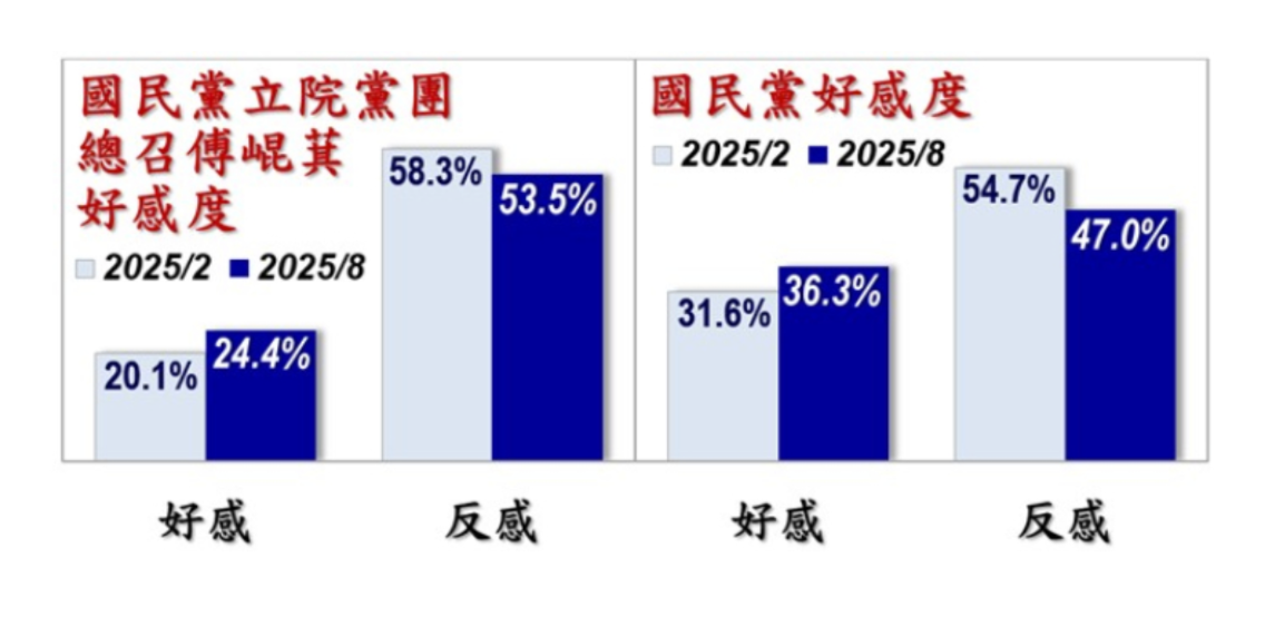 立法院三大黨團總召也受到檢驗:民進黨柯建銘好感度僅14.3%,反感度高達68.5%;國民黨傅崐萁好感24.4%、反感53.5%;民眾黨黃國昌則以35.9%好感領先,但仍有48.5%反感。