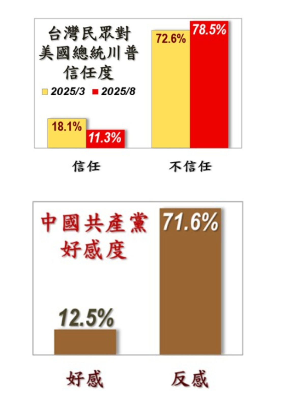 在國際領袖與政黨觀感上,美國總統川普僅獲11.3%信任,高達78.5%不信任;中國共產黨的好感度亦僅12.5%,反感度達71.6%。台灣民意對美中皆表現出高度不信任,川普的負面觀感更為顯著。