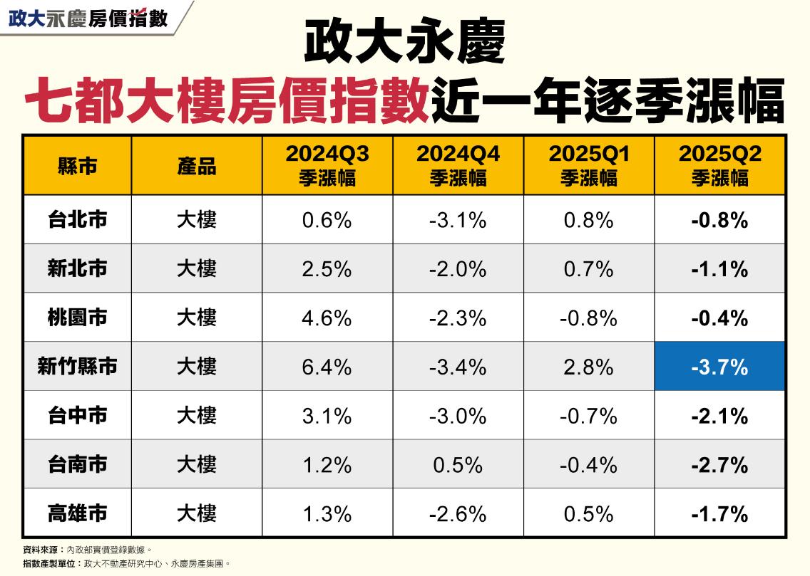 2025Q2新竹縣市大樓指數跌幅最深,單季跌幅達3.7%