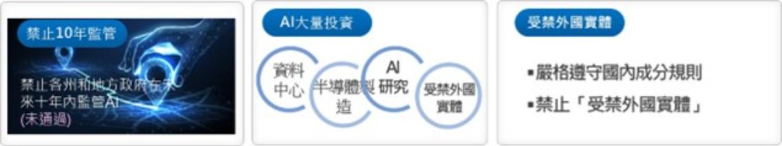《大而美法案》將投入約2兆台幣經費,包含聯邦資金、撥款和稅收優惠等措施,以發展AI技術及基礎環境包含涵蓋興建新世代資料中心、擴建發電與輸電基礎設施,以滿足AI所需的用電成長,並鼓勵企業培訓AI人才與提供實習機制。不過,此法案亦限制敵手(特別是中國),及強化技術授權及智財權審查策略(詳見下圖)。