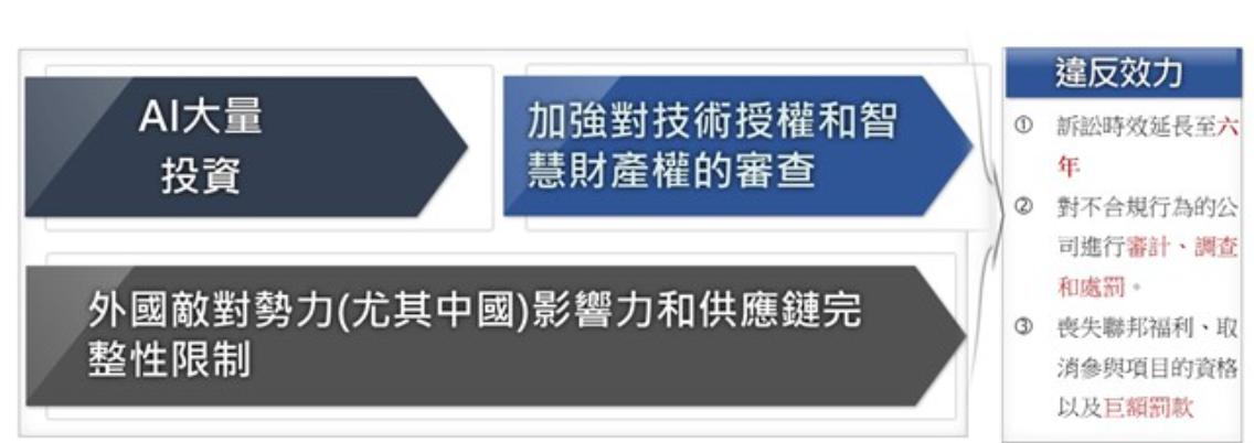 (1)加強AI技術授權契約審查,確認技術授權或取得是否受到受禁外國實體的控制。