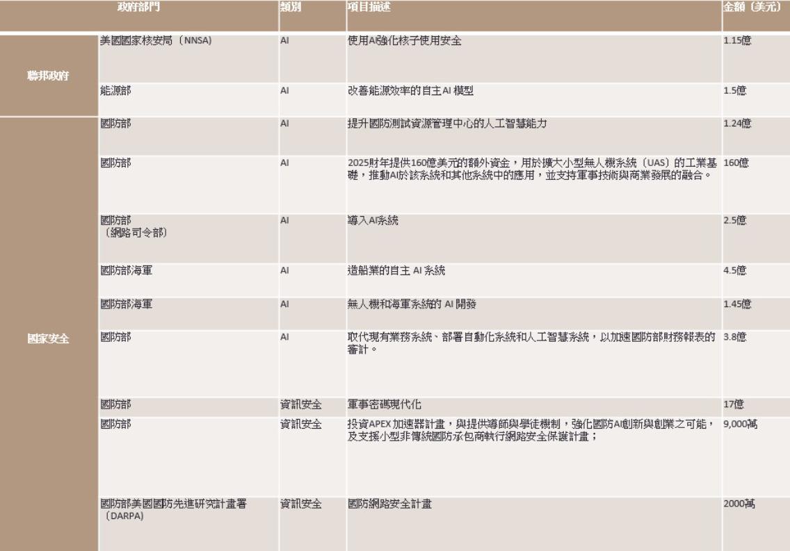 若簡單分析美國《大而美法案》的各項AI相關子計畫投資,可以發現著重於AI自主模型開發與導入,其中又以國防及資安項目最為重要,例如2025財年至2029年9月30日強化國防部的資源應用效率,以降低武器生產成本,及擴大生產規模,包含2025財年提供160億美元的額外資金,用於擴大小型無人機系統(UAS)的工業基礎,推動AI於該系統和其他系統中的應用,並支持軍事技術與商業發展的融合,及投入1.24億美元研發AI技術,以提升國防測試資源管理中心的人工智慧能力;同時亦投資2.5億美元予網路司令部導入AI系統。