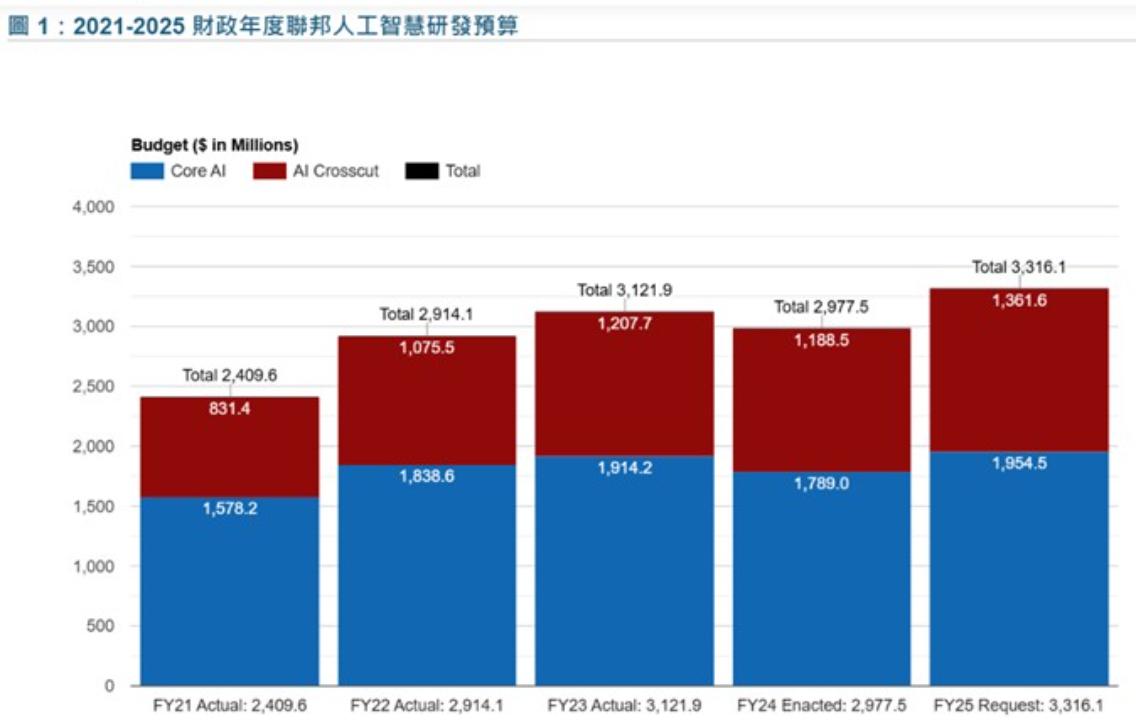 回顧,2019年至2025財年,美國於人工智慧投資研發經費由24億美金成長至33億美金,成長率達37.5%,主要投資於機器視覺AI方法的研發、機器學習、AI的網路安全挑戰(例如人工智慧系統的缺陷)、語言學演算法;及神經網路優化的運算架構或晶片。