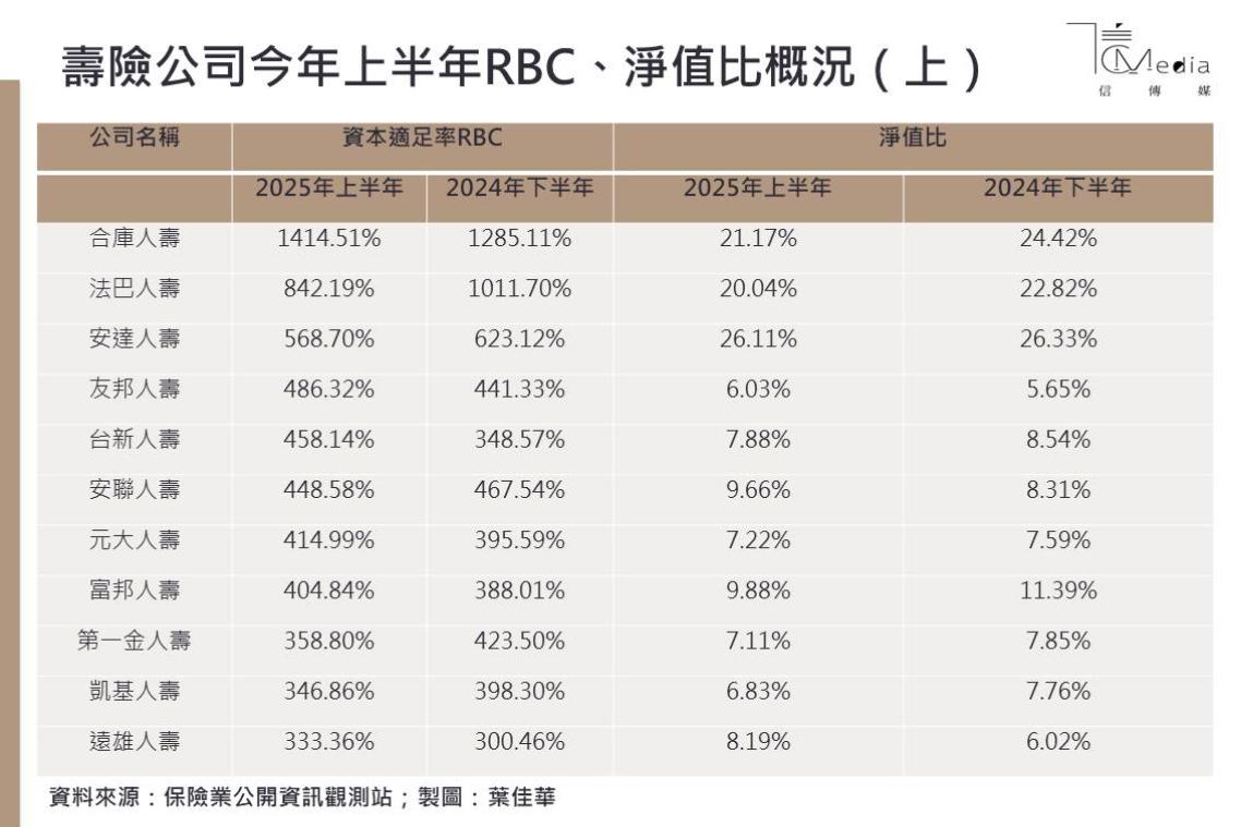 攤開各家壽險業上半年的資本適足情況,其中合庫人壽、法巴人壽、安達人壽、友邦人壽、台新人壽、安聯人壽、元大人壽、富邦人壽等8家資本適足率(RBC)皆超過400%;而合庫人壽、友邦人壽、台新人壽、元大人壽、富邦人壽、遠雄人壽、三商美邦人壽等資本適足率(RBC)則與去年底相比有所回升。