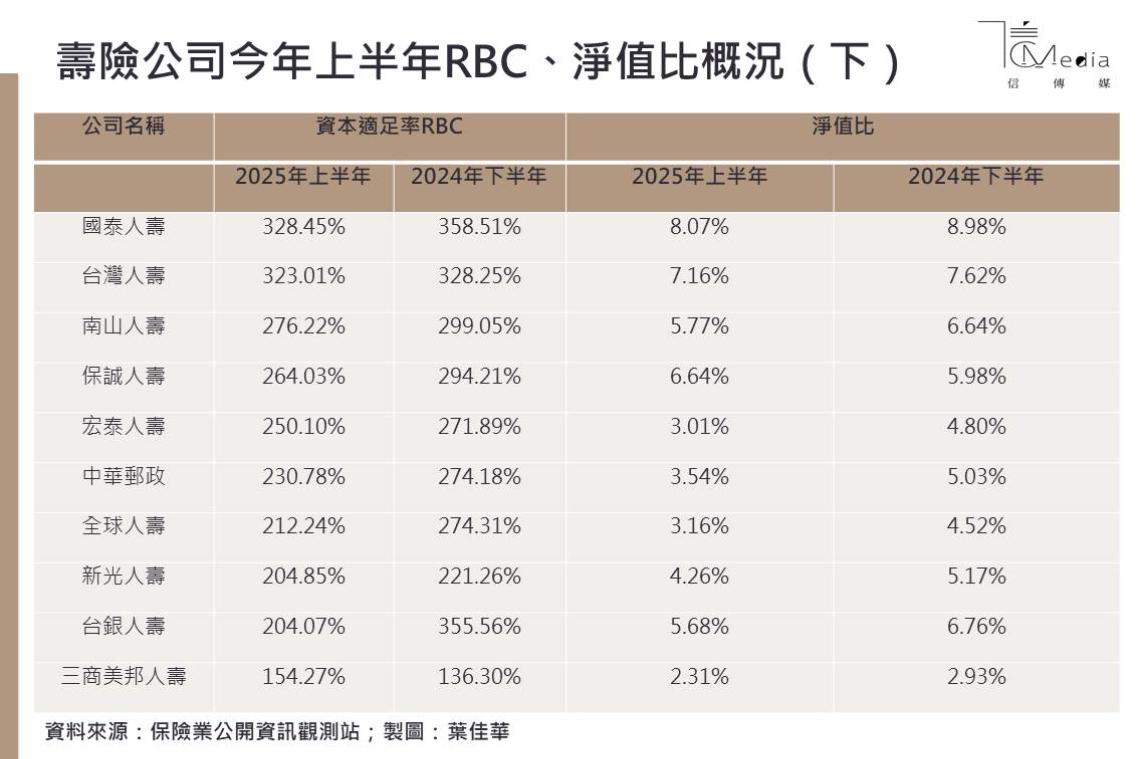 隨著金融業半年報已在8月31日全數完成申報,壽險業的資本適足性指標(資本適足率、淨值比)也雙雙出爐,其中有7家壽險公司今年上半年的資本適足率(RBC)比去年底回升,其餘皆比去年底來得下滑,其中,三商美邦人壽上半年RBC、淨值比皆未達標,必須進行9月底的「補考」。