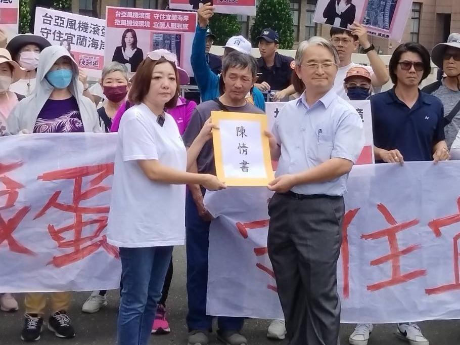 為此,宜蘭鄉親與民眾黨宜蘭黨部主委陳琬惠今(2)日北上行政院前大喊口號,向行政院遞交陳情書反對台亞風機入住宜蘭,「要風機滾蛋、守住宜蘭」。
