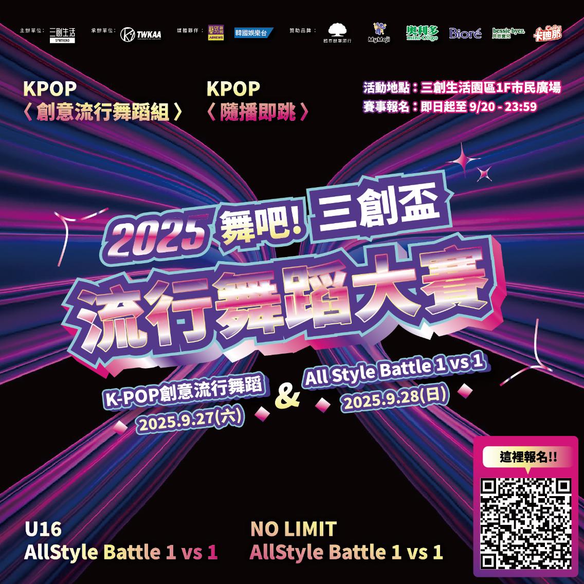 歡慶10週年,三創首度盛大舉辦「2025 舞吧!三創盃流行舞蹈大賽」,除了呼應三創的品牌精神外,更回應台灣近年來持續延燒的K-Pop舞蹈熱潮。這次特別與TWKAA台灣動態藝術協會合作,不僅提供舞者們展現才華的絕佳舞台,更是一場融合多元風格的舞蹈盛會。本次賽事包含深受大眾喜愛的「K-POP創意流行舞蹈組」,以及考驗個人創意及表演能力的「K-POP隨播即跳」,同時也為街舞好手們準備了「AllStyle Battle」組別,且所有項目皆完全免費報名。這次競賽曲目中還隱含了三創10週年以AI產製的三創品牌主題曲,這首歌曲也將成為本次賽事的重要彩蛋,為比賽增添獨特亮點,同時更考驗選手的臨場反應與即時編舞能力。無論是K-Pop舞團或街舞高手,都歡迎前來三創市民廣場一同Battle,盡情享受在舞台上尬舞的樂趣,並爭取高額獎金!