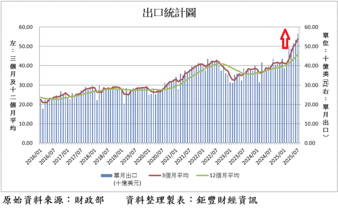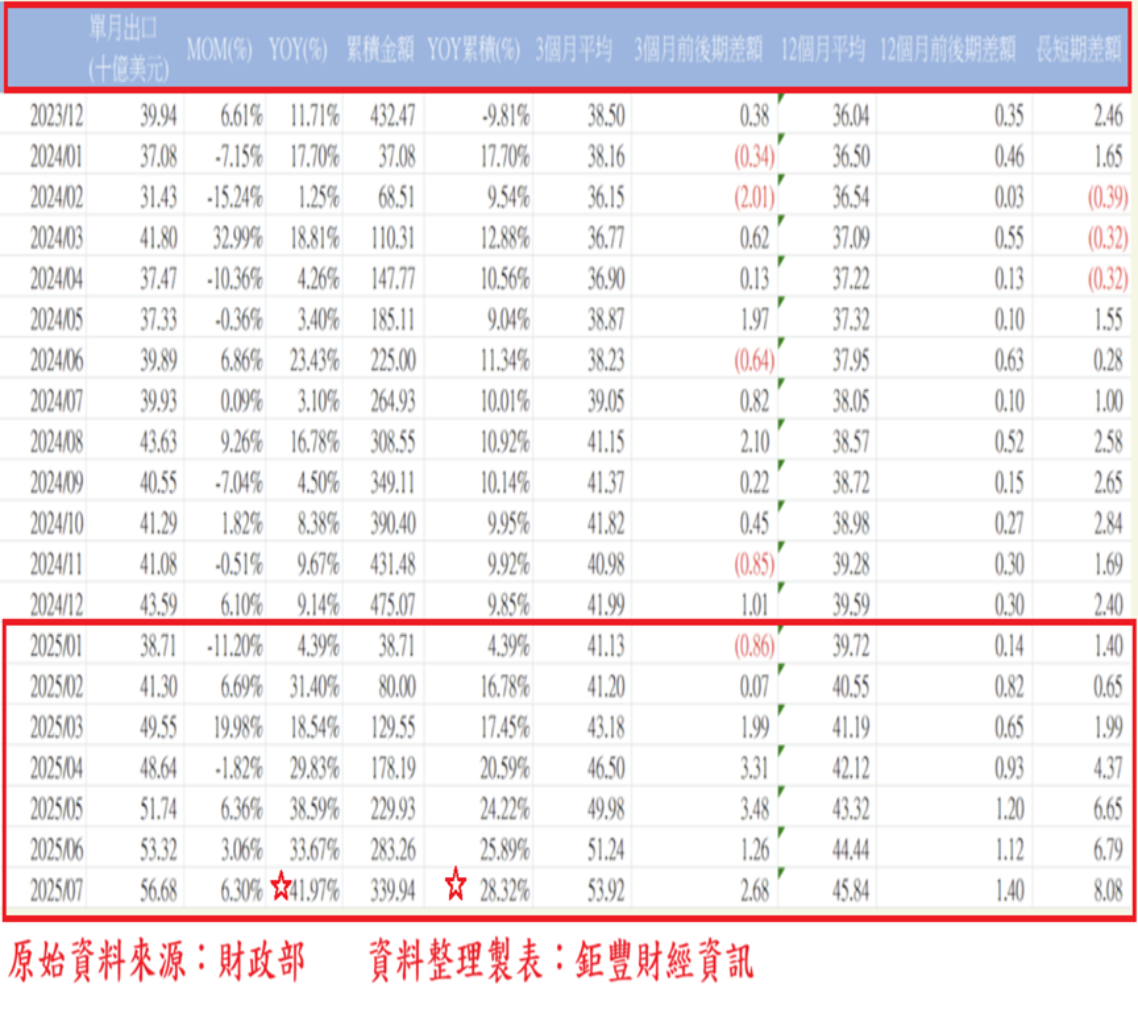 截至2025年7月,3個月平均出口金額較6月上升26.8億美元,連續15個月高於代表長期趨勢的12個月平均出口金額,至2025年7月的12個月平均出口金額較6月上升14億美元,12月出口平均線連續第21個月上揚,顯示台灣出口長期趨勢動能仍處於穩定上升之中。