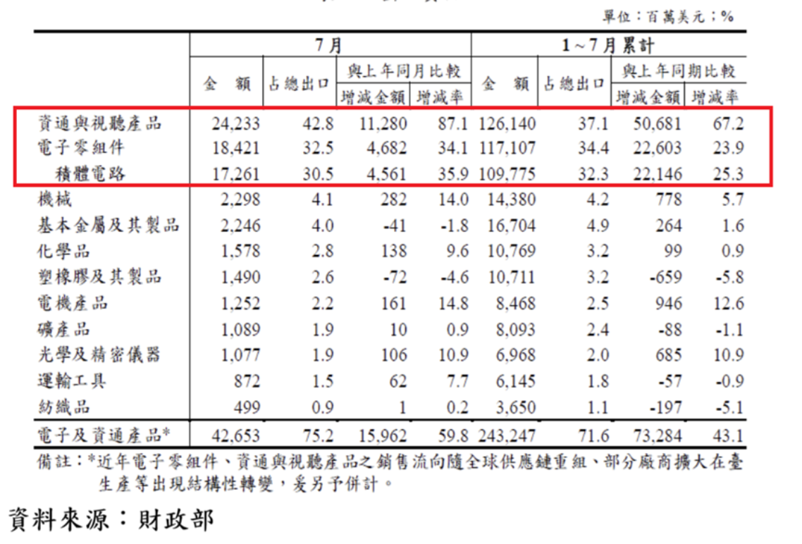 占7月單月總出口比例達42.8%的資通與視聽產品出口持續成長,年增高達87.1%,資通與視聽產品累計前7月出口占率37.1%,年增高達67.2%,AI產業供應鏈顯然仍為貢獻我國出口成長的最大產業類別。2024年累計占總出口比例27.9%,年增率達59%,資通與視聽產品,含電腦及其附屬單元、電腦之零附件、交換器、路由器、儲存裝置、手機等,持續扮演推升出口成長動能的最重要產業。