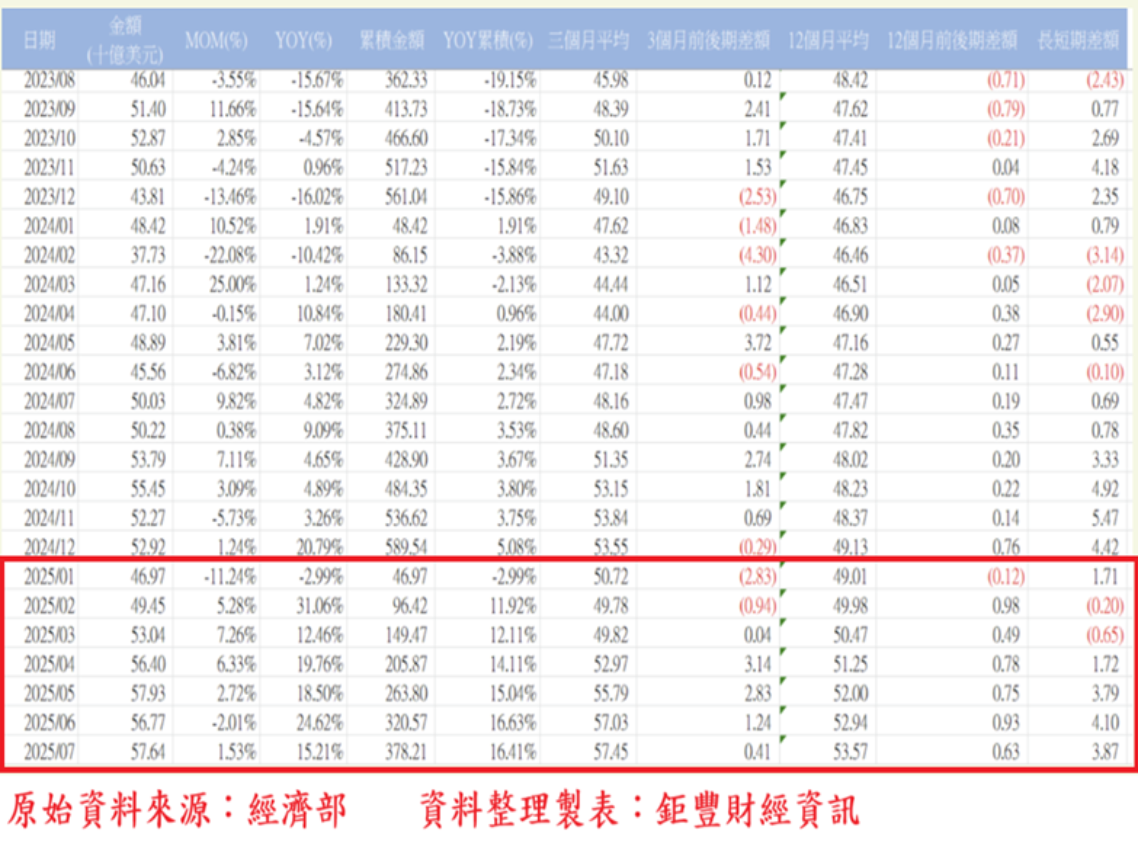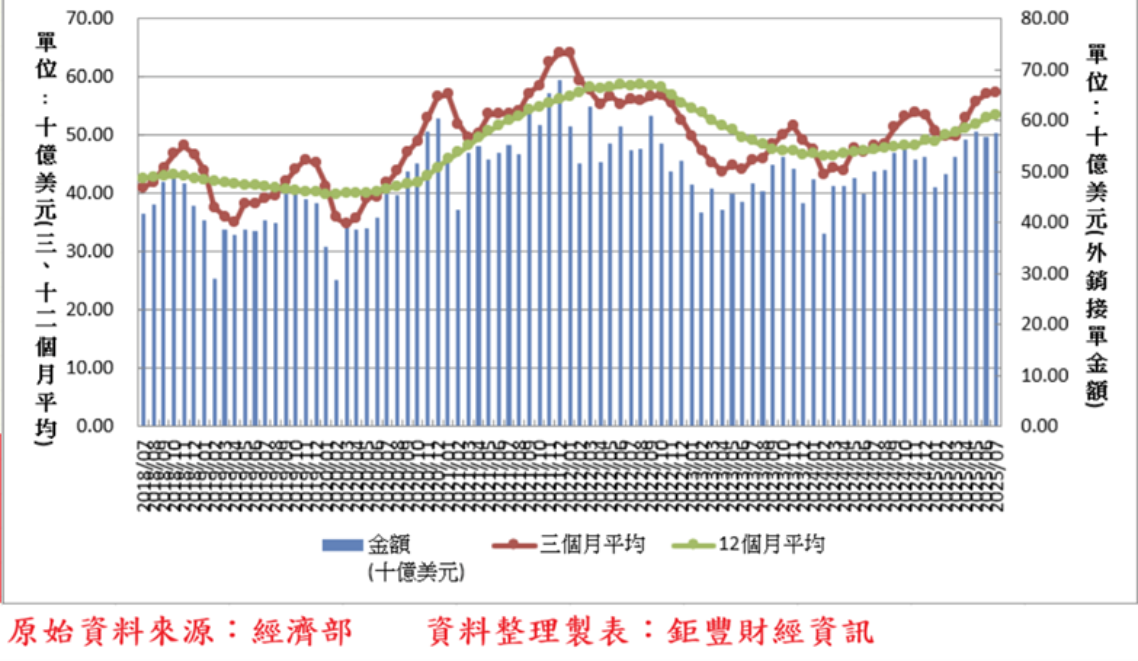 截至2025年7月,12個月平均外銷接單535.7億美元,上升6.3億美元,連續第6個月上升;3個月平均外銷接單574.5億美元,較6月上升4.1億美元,3個月平均外銷接單連續5個月回升,且連續第4個月高於12個月平均外銷接單的535.7億美元,顯示長、短期外銷接單趨勢持續同步呈現成長上揚趨勢。