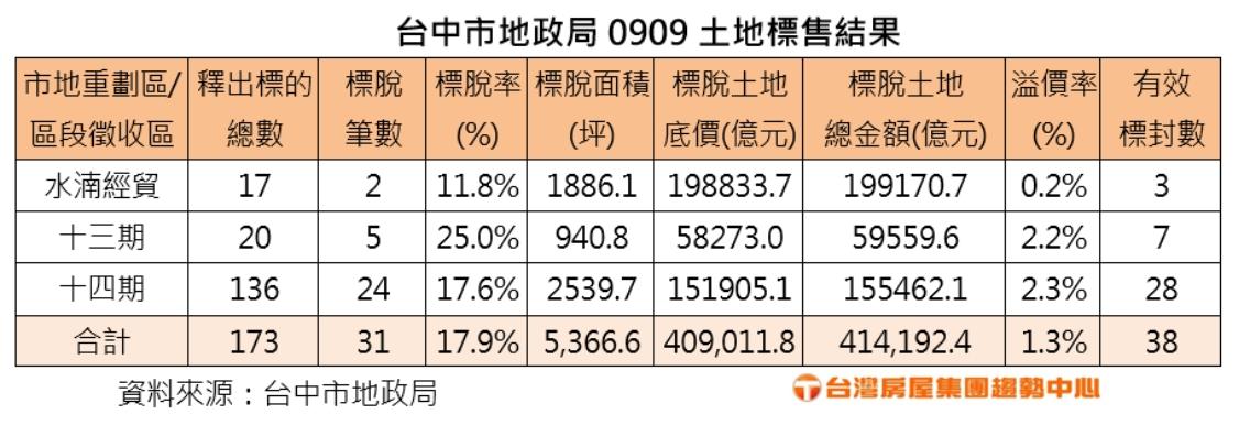 本次台中市土地標售共釋出173筆土地,總底價將近227億元,但投標狀況仍不盡理想,計有41封標單參與34筆土地的競標,其樂田段有3筆土地共3封標單作廢,總計有效標封數38封,最終標出31筆土地,整體標脫率僅17.9%,只略高於6月標售的17.6%,土地標售的標脫率已連續三次低於2成,整體溢價率也只有1.3%,標脫總金額41.4億元,更是近期標售的新低,顯示買家出價十分保守,市場氣氛似乎未因金管會鬆綁銀行法72-2天條轉熱。