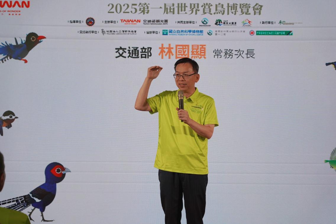 交通部次長林國顯表示,北回歸線上的台灣從水平面到高山,生態環境非常多元,從小讀的《山林裡的小精靈》就是一本跟賞鳥有關的書。加上林保署與國家公園署對生態保育的努力,提供鳥類優良的棲息地,所以台灣的鳥類越來越多。林次長回憶起國中時看過的黃鸝鳥,20年沒看見了;最近看到非常多人拍到,還拍到朱鸝、長尾山娘。這樣一個豐富多元的環境,無論專業或業餘的賞鳥活動都能在台灣各個地區進行。友善的旅遊環境更是全球鳥類愛好者嚮往的賞鳥天堂。我們深感驕傲,能將這份獨特的生態寶藏,透過世界賞鳥博覽會,分享給全世界,也藉由賞鳥活動讓世界看見台灣。