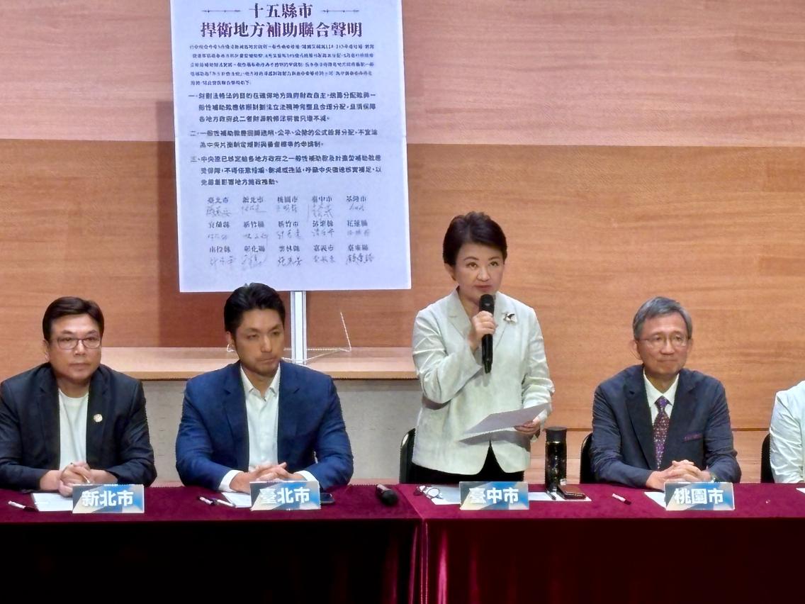 中央分配地方補助款爭議延燒,在台中市長盧秀燕召集下,藍白15縣市首長今(10)日舉行捍衛地方補助聯合記者會,提出三大建議,要求中央重新計算並公開公式,以及補助款不要改為申請制,以及計畫型補助款更應公平、公開分配。