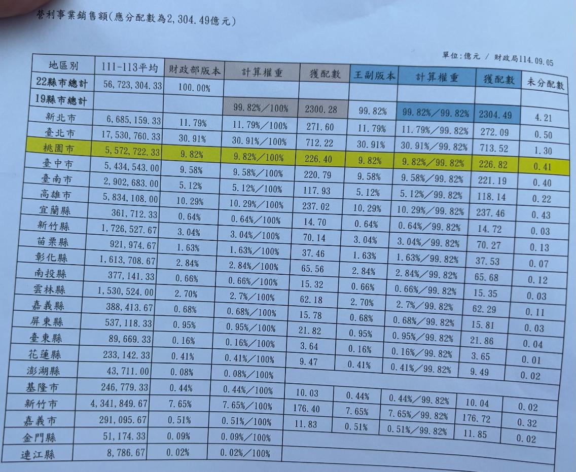 王明鉅受訪時稱,這個公式很簡單,分母是全國22個縣市的總額,但有19個縣市分90.5%、3個縣市2.5%,譬如台北市、台東縣、新北市、桃園市的數字都很明確,就按照這個比率來分就好,跟公式有無錯誤無關,中央故意找麻煩,「真的不是國家之福,也不是地方之福。」