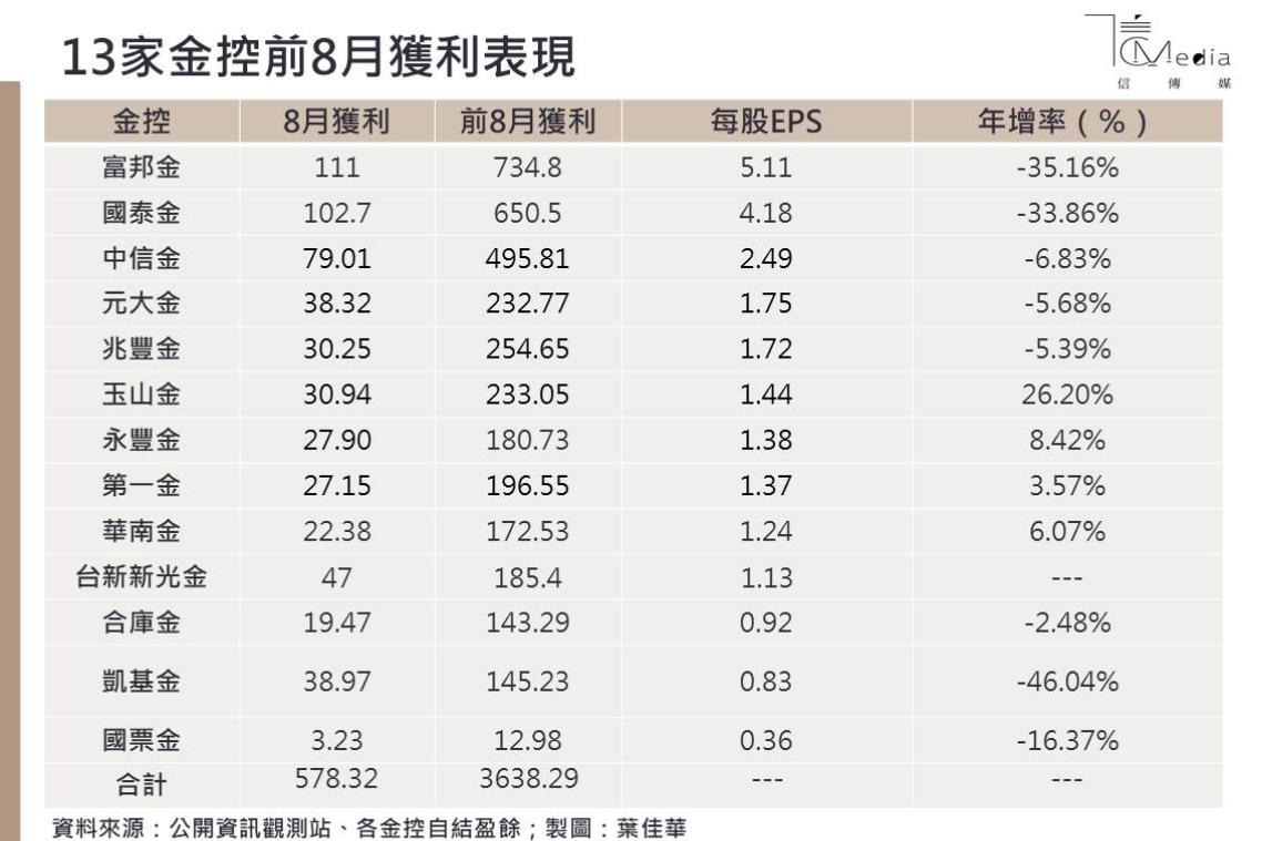 根據各家金控10日公告的自結稅後盈餘概況,其中,累計今年前8月獲利,富邦金以稅後淨利734.8億元、EPS 5.11元居金控第1名;國泰金則以稅後淨利650.5億元、EPS4.18元緊追在後;中信金則以稅後淨利495.81億元、EPS2.49元名列第3名。
