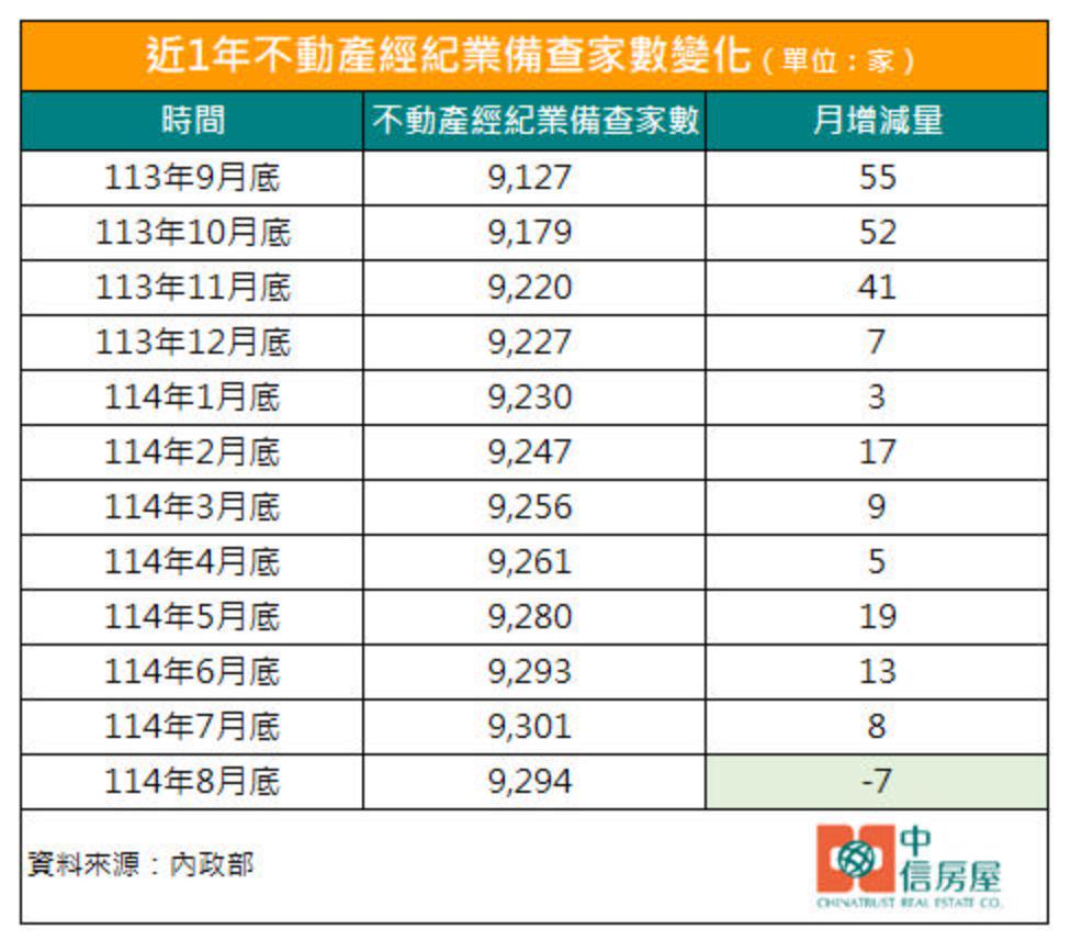 過去幾年,房價持續攀升,市場交易熱絡,不動產經紀業也隨之迅速擴張。然而,近一年來市場明顯降溫,房仲業的展店步伐也逐步放緩。根據內政部最新統計,截至今年8月底,全國不動產經紀業備查家數為9,294家,較7月底的9,301家減少7家,雖然幅度不大,卻也終結了自2023年1月以來連續31個月的增長趨勢。