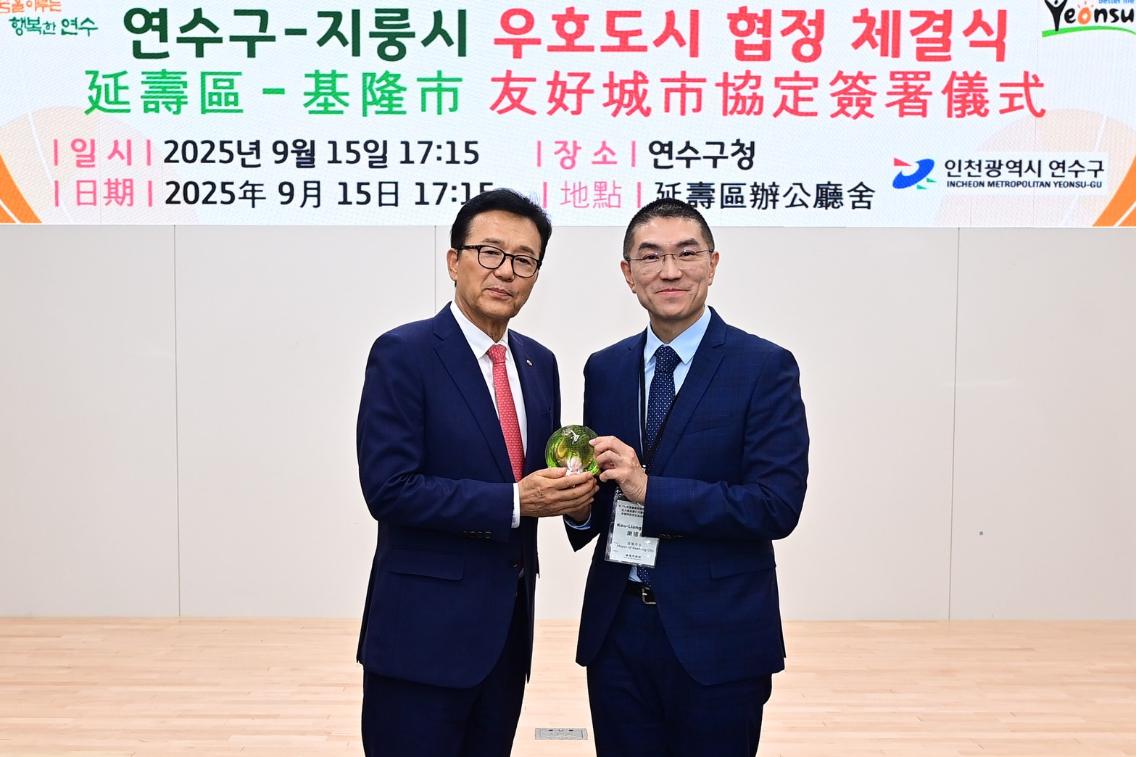基隆市長謝國樑昨(15)日率領代表團赴韓國仁川廣域市延壽區,與李載浩區廳長共同簽署友好城市協定,正式宣示兩地在青年交流、促進觀光合作、永續發展海洋文化、創新經濟等領域展開深度交流。謝國樑親切地用韓語的「哥」尊稱李廳長,並強調期望透過此次締盟,與擁有松島國際都市優勢的延壽區互相借鏡及攜手共進,推動基隆城市治理升級,並建立長久永固的夥伴關係。