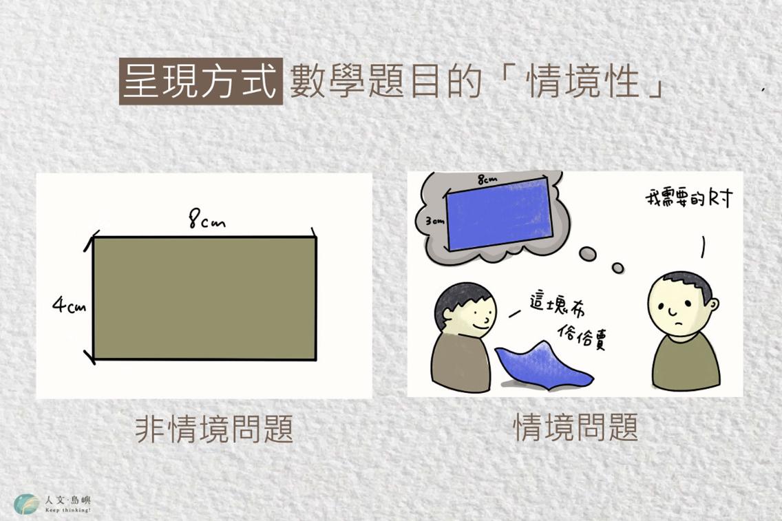 呼應前面提到芬蘭的例子,數學問題可依據「呈現方式」分為「情境問題」或「非情境問題」。