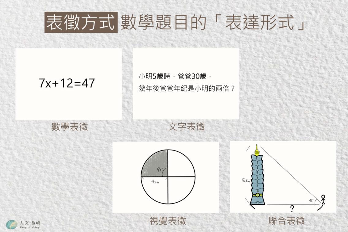 相同的數學知識,可以透過不一樣的形式表達與探詢,也就是「表徵方式」。楊德清根據表徵方式的差異,將數學問題分成以下四類: