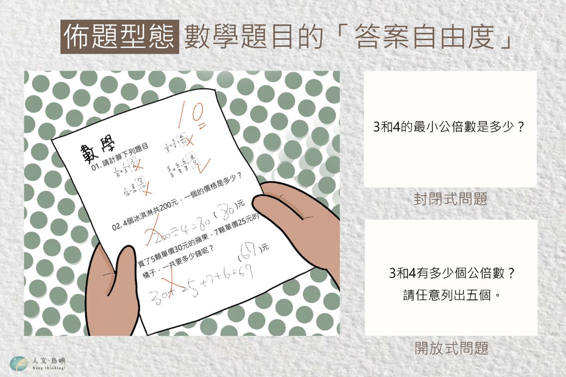 國民教育階段,絕大部分的數學問題都屬於有標準答案的封閉式問題。相對而言,開放式問題提供學生自由回答的空間,讓每個人可以根據當下的學習程度與理解方式,寫出自已獨特的答案。開放式問題在臺灣中小學數學教科書裡相對少見。以國中階段的幾何教材為例,美國「連結數學」教材包含高達三成的開放式問題,臺灣教材卻只有3%。