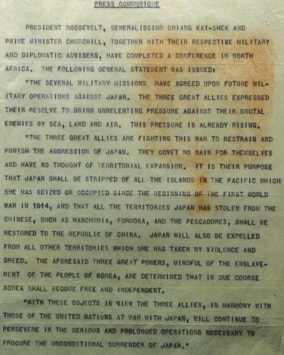 對於中共及國民黨都引述開羅宣言、波茨坦宣言等二戰文件,多位歷史學者及國際法學者都表示,這兩份文件不僅相關盟國領導人並未簽名,也未經國會批准,因此僅屬新聞公告性質,所以事後尚須與日本締結正式和約。